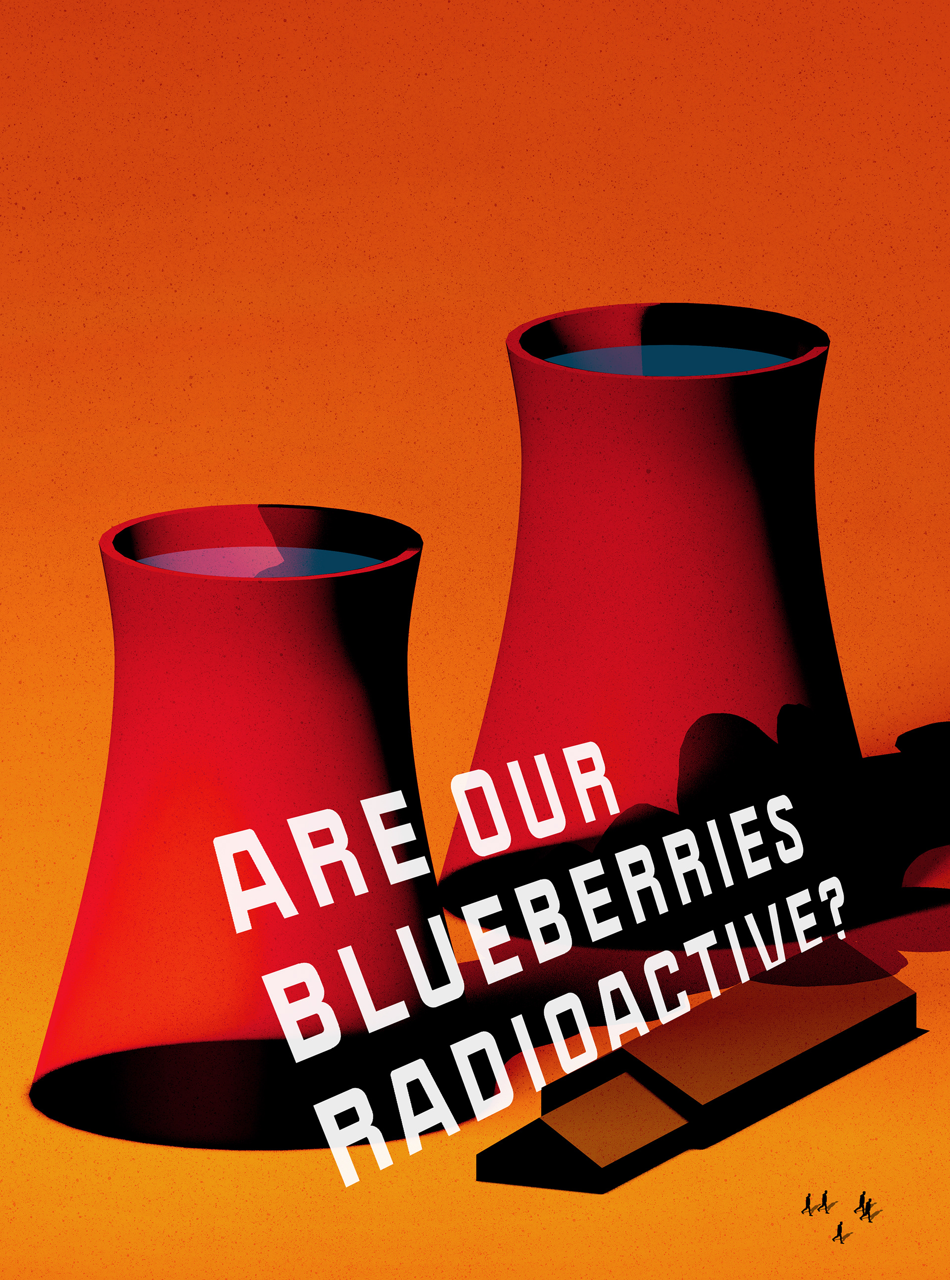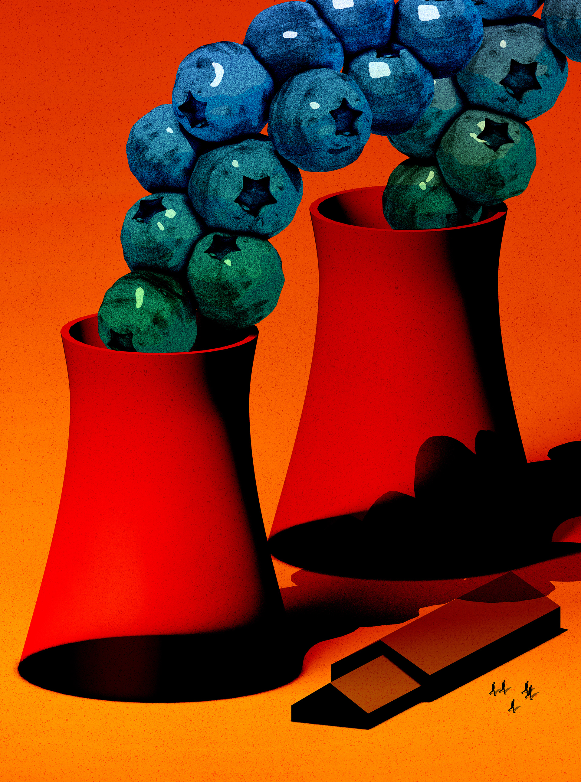 Editorial illustration for the Guardian's daily podcast 'Today in focus' discussing the aftermath and coverup of the Chernobyl nuclear disaster, leading to the questioning of if our blueberries are radioactive.