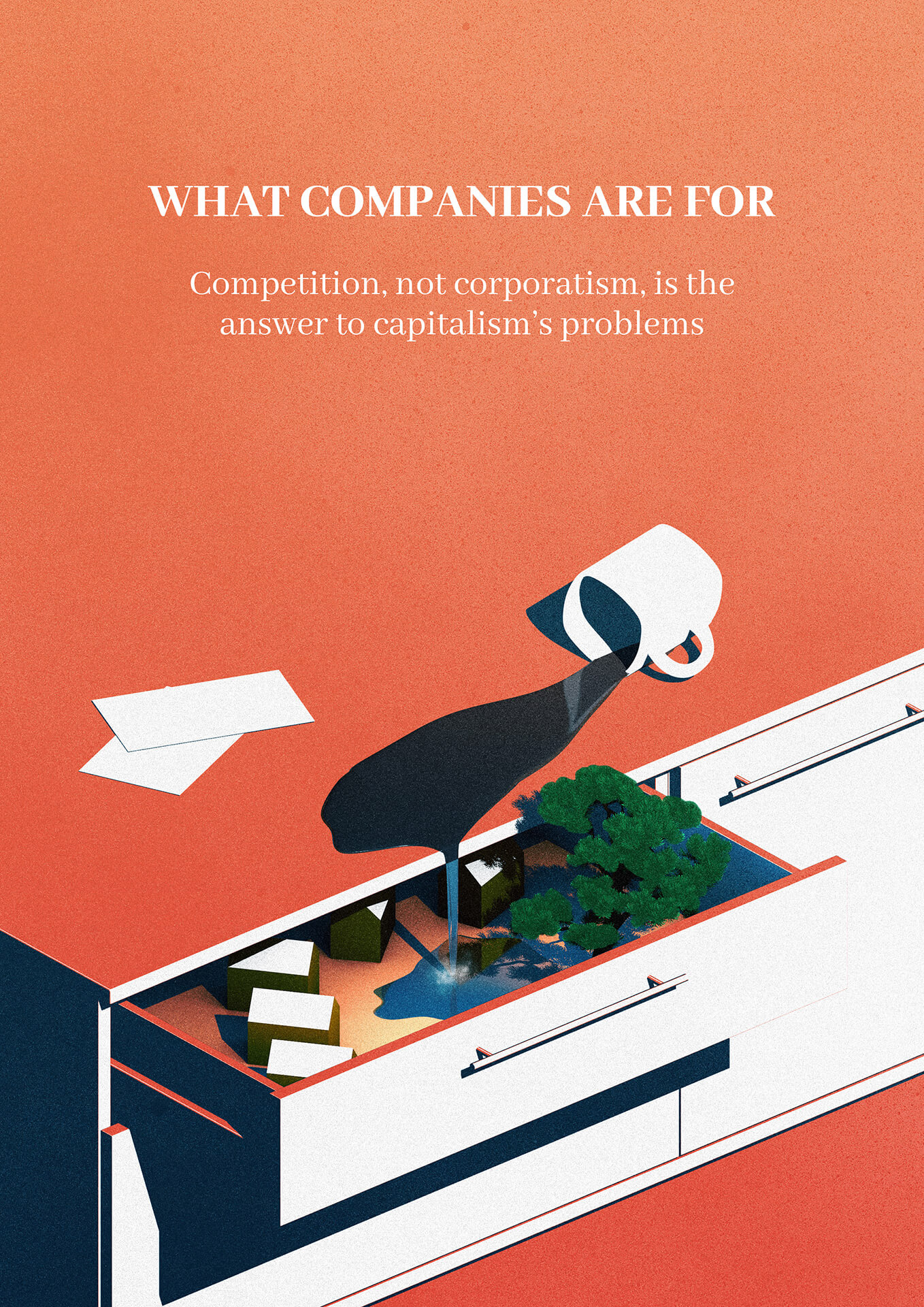 An editorial illustrations based on an editors pick article from the economist. All about what companies are really for, and how much moral responsibility they have to society.